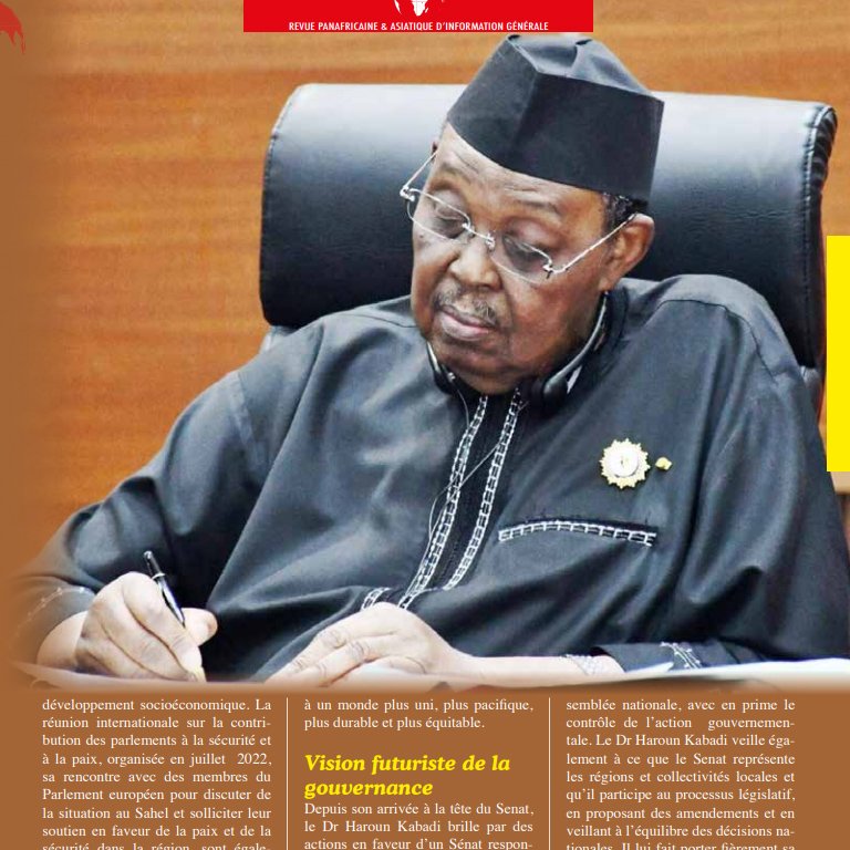 et voter les lois aux côtés de l’Assemblée nationale, avec en prime le contrôle de l’action gouvernementale. Le Dr Haroun Kabadi veille également à ce que le Senat représente les régions et collectivités locales et qu’il participe au processus législatif, en proposant des amendements et en veillant à l’équilibre des décisions nationales. Il lui fait porter fièrement sa casquette de garant du dialogue démocratique et de la stabilité politique.